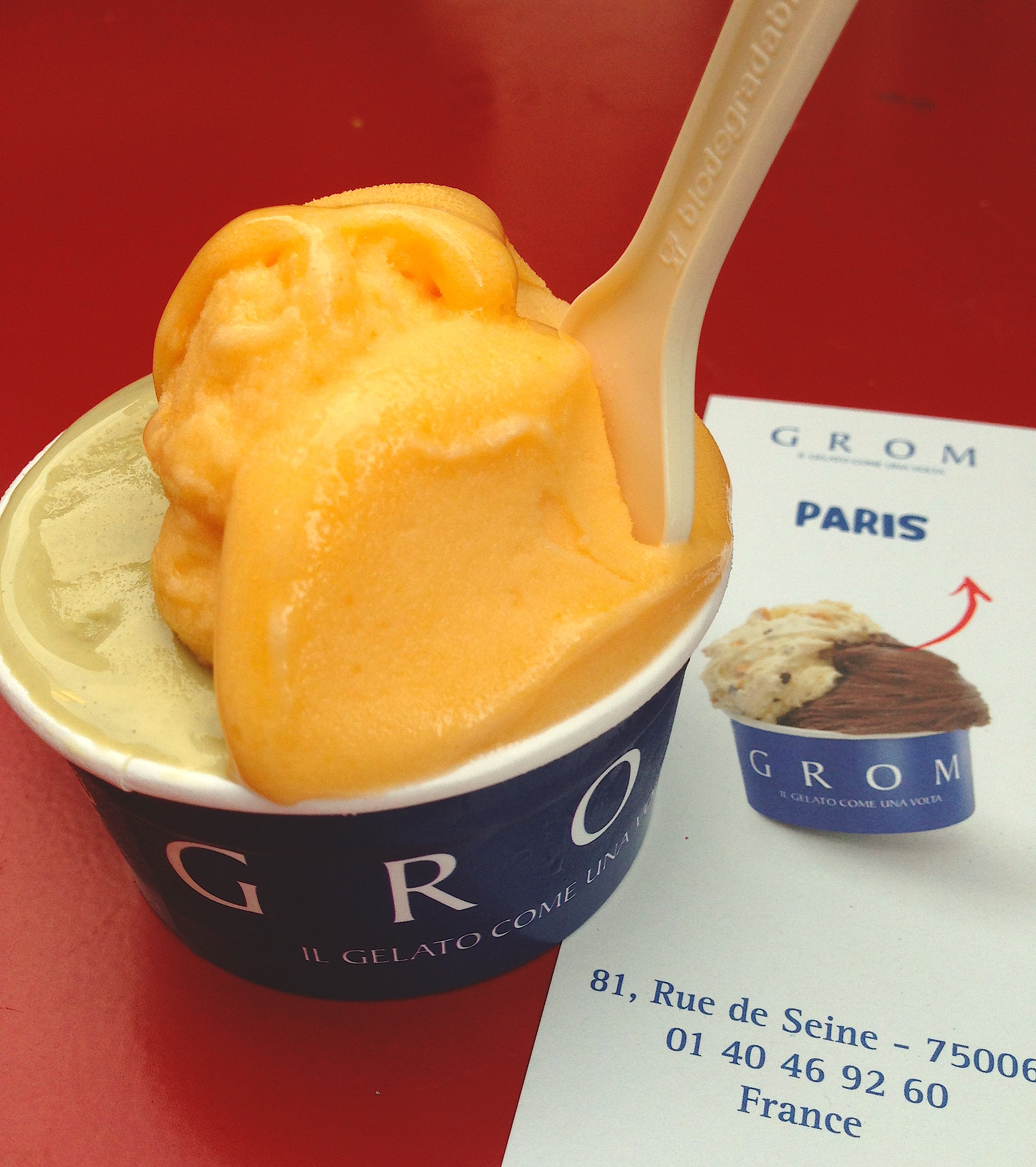 Grom http://www.grom.it/en/81 Rue de Seine, 75006 Paris Tel.: +33 1 40 46 92 60 April - September: Mon/Wed 12:00pm-11:00pm - Thu/Sat 12:00pm-12:00am - Sun 11:00am-11:00pm October - March: Mon/Thu 12:30pm-10:30pm - Fri/Sat 12:30pm-12:00am - Sun 11:30am-10:30pm
